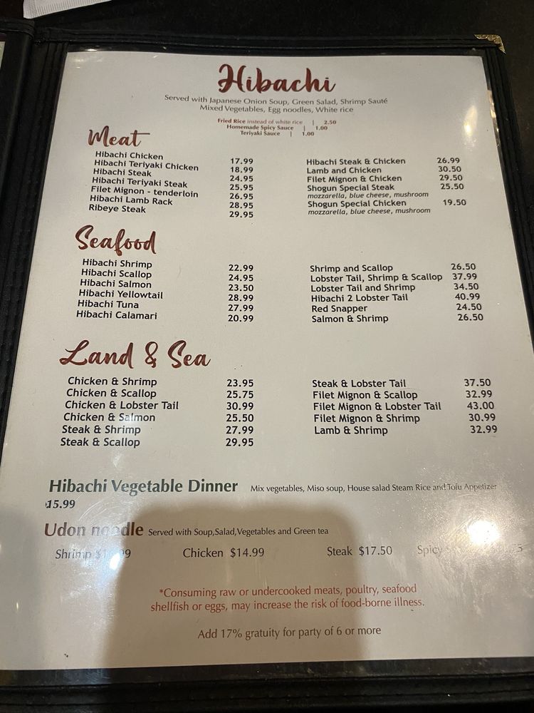 Served with Japanese onion soup, green salad, shrimp appetizer, hibachi vegetables, steamed rice and egg noodles.